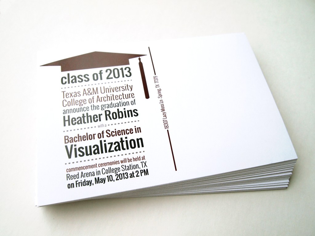 Graduation Announcements For graduation, I created my own postcard announcements. Share this: Click to share on X (Opens in new window) X Click to share on Facebook (Opens in new window) Facebook Like Loading...